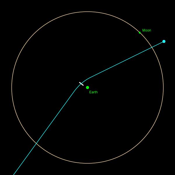 2029年侵入人类领地的“毁神星”。蓝色小点为人造卫星群,黄色轨迹为“毁神星”。NASA