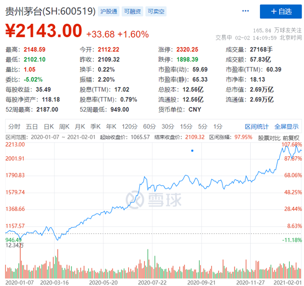 在这一年时间里,茅台的股价和市值双双屡创新高,单价从 1000 元 / 股上下涨到了 2000 余元,几乎翻了个倍,稳坐中国股市第一股。