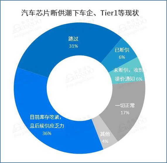 根据盖世汽车网的一份涵盖 1600 人的调查报告显示,近半的参与者表示其所在企业已经遇到芯片库存紧张、断供或是涨价等情况,仅有 17% 的参与者认为目前供应一切正常。