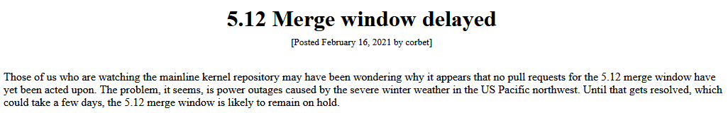 我们这些正在关注主线内核仓库的人可能一直在想,为什么5.12合并窗口的拉取请求似乎还没有被执行。问题是由于美国西北太平洋地区的严冬天气造成的停电。在这一问题得到解决之前(可能需要几天时间),5.12合并窗口很可能会被搁置。