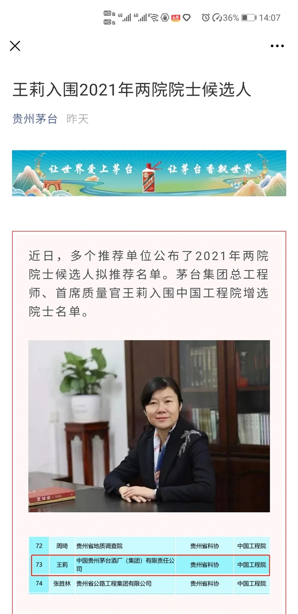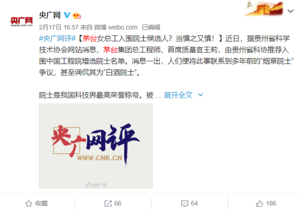随后央广网发布评论称,近日,据贵州省科学技术协会网站消息,茅台集团总工程师、首席质量官王莉,由贵州省科协推荐入围中国工程院增选院士名单。消息一出,人们便将此事联系到多年前的“烟草院士”争议,甚至调侃其为“白酒院士”。