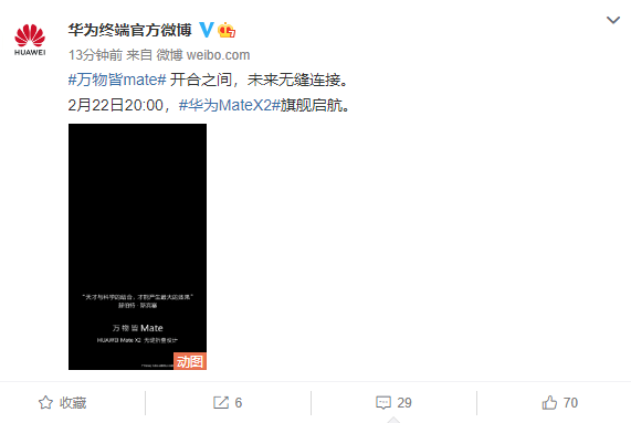 @华为终端官方微博 预热称:“#万物皆mate# 开合之间,未来无缝连接。2月22日20:00,#华为MateX2#旗舰启航。 ”