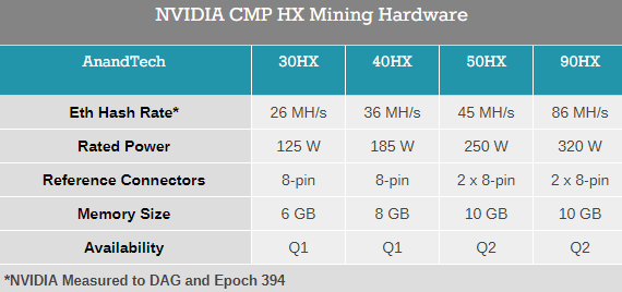 根据最新消息,这种产品的完整名字是CMP HX系列,包括四款不同型号30HX、40HX、50HX、90HX,授权经销商包括华硕、七彩虹、EVGA、技嘉、微星、同德、栢能,两款低端型号本季度末上市,两款高端型号下季度跟进。