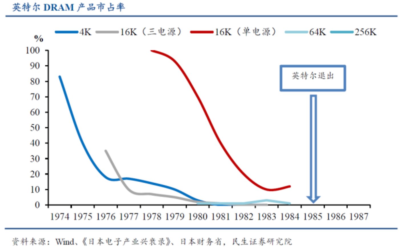 也是这一年,英特尔退出自己一手缔造的DRAM市场,以此为标志,英特尔的退出造就了日本1985年取得全球80%的巅峰市占率。