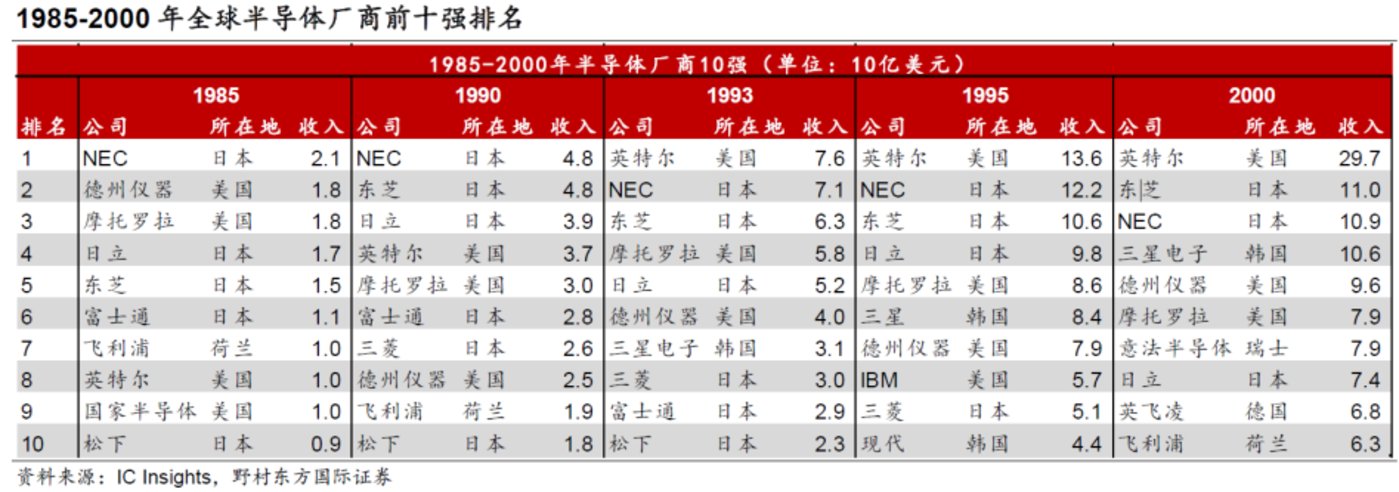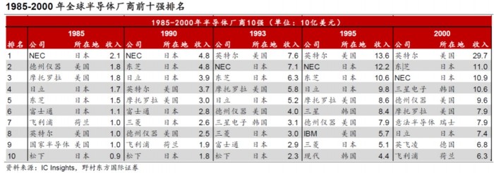 1995年,世界半导体企业前十中,NEC(第一)、东芝(第二)、日立制作所(第三)、富士通(第八)、三菱电机(第九),这一年也成为了日本半导体产业最后的余晖,日本最终失去了这场战争。