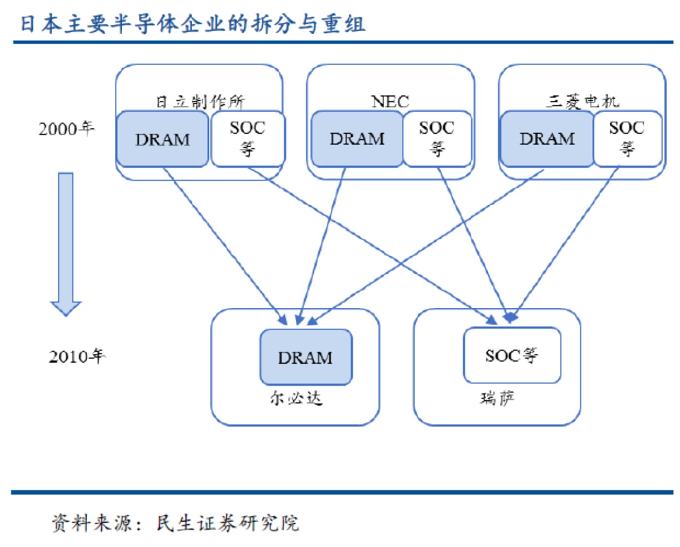 2010年4月,NEC电子和瑞萨科技合并,重组为瑞萨电子,日立、三菱电机退出半导体市场。