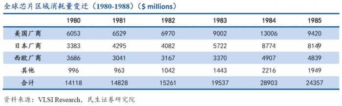 此外,日本半导体产业的急速发展,也体现在了对于芯片的消耗量上,从1980年开始,日本国内的芯片消耗量一直处于增长状态,在1984年达到那几年间的最大值,到1985年,仅落后于美国,远超过后面的欧洲。