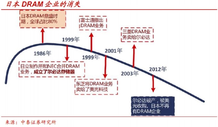1999年,NEC和日立分别剥离旗下DRAM业务,成立了新公司尔必达(Elpida),2004年三菱电机的DRAM业务部门也被并入,自此,在1995年的全球十大半导体厂商排名中分别位列第二、第四和第九的三家日本半导体厂商的DRAM业务合并为新的公司尔必达。