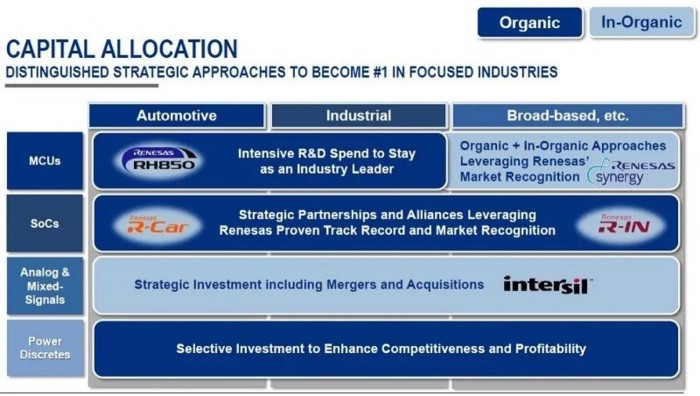2017年2月25日,瑞萨完成对Intersil的收购。这笔32.19亿美元的收购,瑞萨将获得Intersil的创新型电源管理及精密模拟解决方案,将在智能化、移动化和高耗电的电子设备,不足电源管理领域的不足,同时将业务从汽车电子、消费电子,进一步扩展到工业与基础设施、移动计算和航空航天等领域。