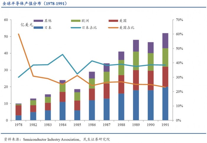 1980至1986年,日本企业的半导体市场份额由26%上升至45%,而美国企业的半导体市场份额则从61%下滑至43%,日本半导体产品的国际市场占有率便超过美国,成为真正的全球第一。