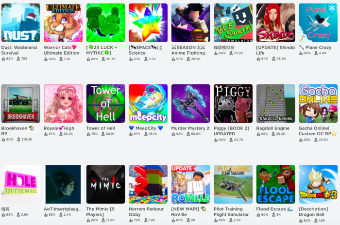 进入 Roblox,玩家需要先创建一个代表自己的“虚拟形象”——马赛克身体和简笔画表情。用虚拟形象游走在热带岛屿,恐怖城堡,繁华城镇等多个地图上,第一人称射击、解谜、动作生存、角色扮演……游戏模式也多种多样。