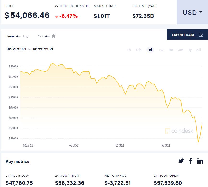 在经历周末大涨、突破5.8万美元创历史新高的一天后,北京时间周一下午时段,比特币持续下跌,接连跌破55000至53000美元的三道整数关口,24小时跌幅扩大至8%。周一美股开盘前10分钟,主流加密数字货币加速跳水,比特币5分钟内跌超3000美元,跌穿5万美元大关后迅速跌至4.8万美元下方,24小时内跌幅扩大至超17%。以太坊日内跌幅扩大至20%,报1547.77美元。