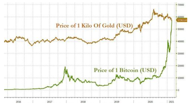 而在上周日,比特币更是刷新历史新高,价格一度飙升至58350美元/枚的历史最高位。1个比特币的价格有史以来首次超过了1公斤黄金的价格。