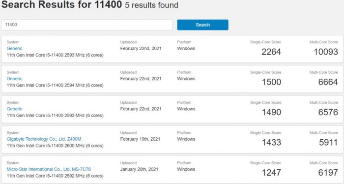 再来看看酷睿i5系列,酷睿i5-11600K在单核测试中获得了最高1622分,多核测试中获得了7013分。不过测试平台使用的是 DDR4-2133MHz 内存,这无疑显示了第 11 代 Rocket Lake CPU 还有进一步性能提升的潜力。酷睿i5-11500,该 CPU 在单核测试中最高得分为 1538 分,多核测试中最高得分为 7434 分。最后是酷睿 i5-11400,它在单核测试中的最高得分为 1500 分,多核测试中的最高得分为 6664 分。