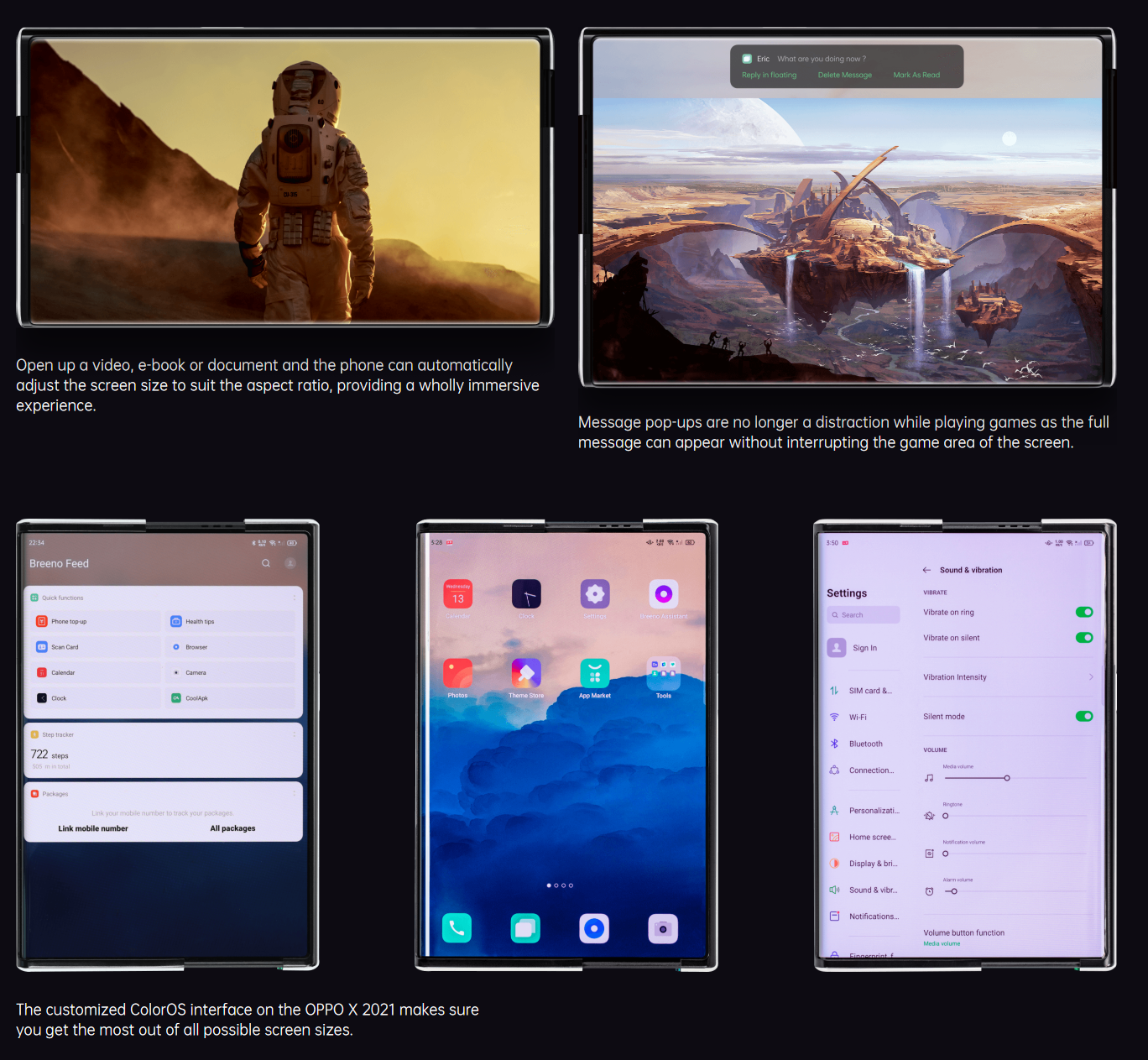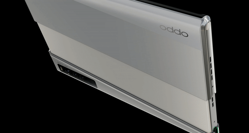 手机侧面的电源按钮可以让用户点亮/关闭手机,而上下滑动按钮可以展开滑动屏幕。OLED显示屏围绕6.8mm轴弯曲,当 OPPO X 2021 在 6.7 英寸模式下使用时,近一半的 OLED 屏幕被存储在手机内部。OPPO 在屏幕下方放置了由钢铁制成的履带(称为 Warp Track),让显示屏可以轻松移动。