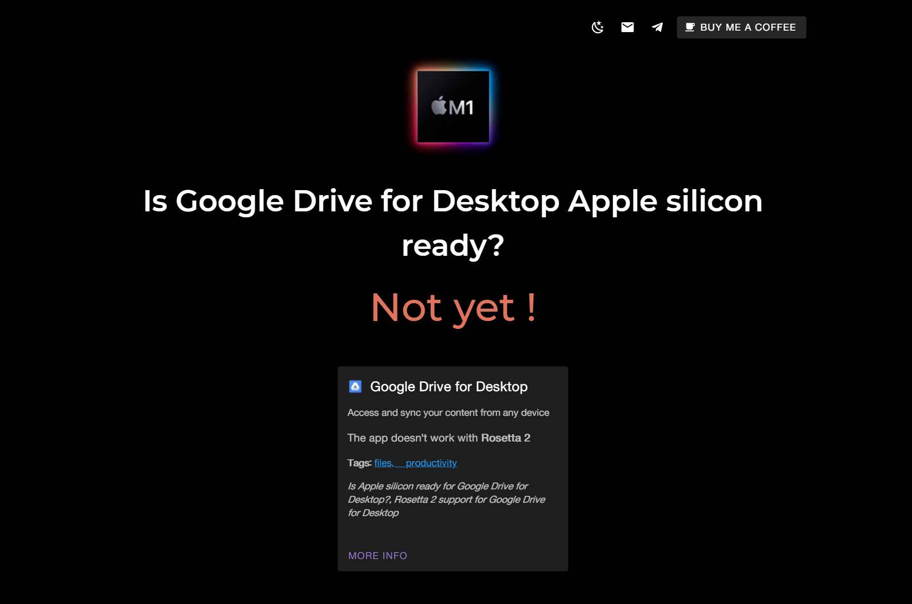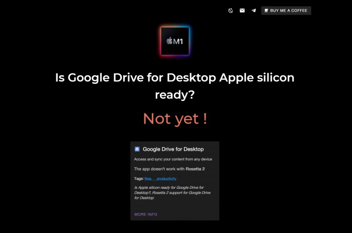 例如桌面端谷歌云盘 Google Drive for Desktop 仍然完全没有适配 M1 芯片,不能利用 Rosetta 2 进行编译;