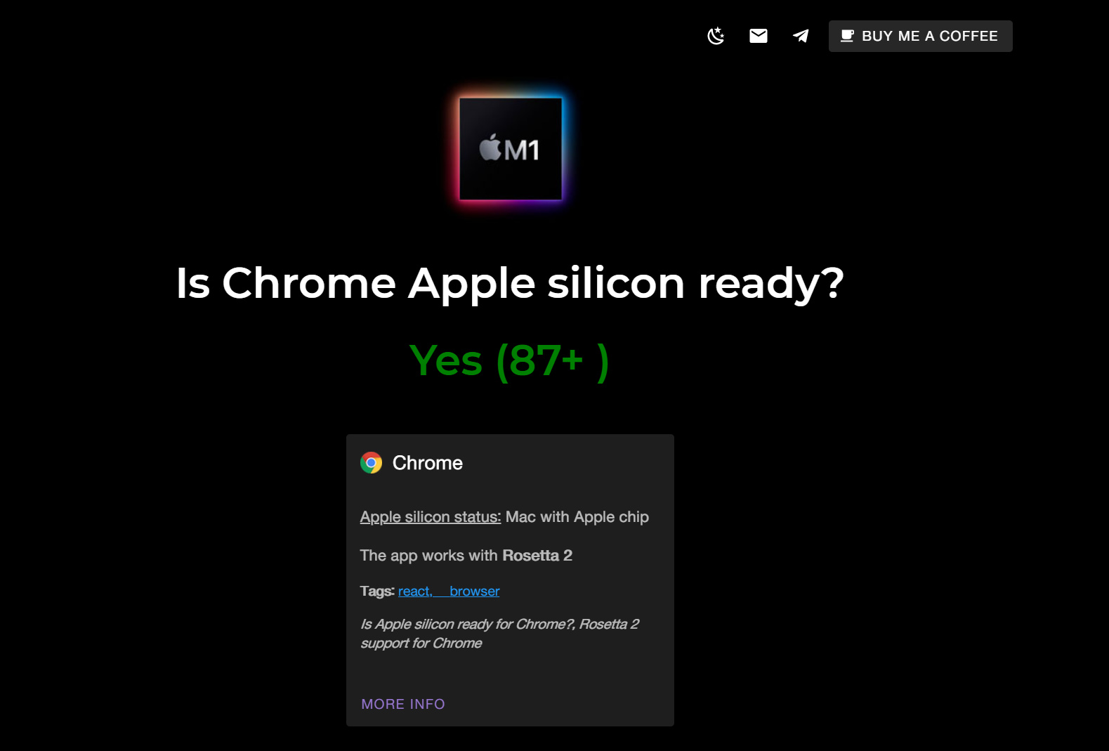 像是已经早早地完成了适配的 Chrome 浏览器,则会被运营者用绿色字体注明 Yes,说明它已经完成了对 M1 芯片的适配,并且运行状态良好;