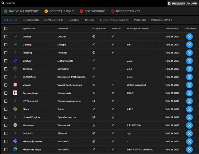 这个网站由两位程序员负责运营,目前已经上传了多达 761 个软件的 M1 芯片适配状况,其中包括浏览器、开发者工具、设计软件、音乐软件、视频制作软件、照片编辑软件以及办公工具等 7 个分类。