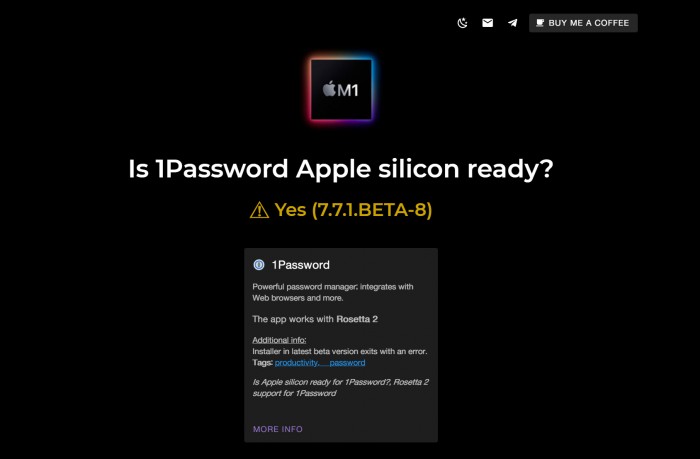 例如市面上最受欢迎的密码管理器之一 1Password 则显示已经在 7.7.1 BETA-8 版本适配了 M1 芯片,但经过检测发现了错误,因此使用黄色字体标记了 ⚠Yes,提醒用户这款软件在使用过程中可能会出现错误;