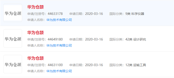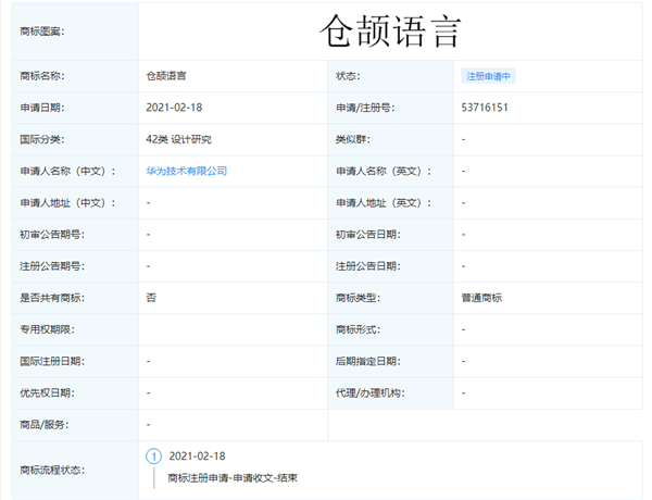 同时,以“仓颉”为关键字搜索发现,华为技术有限公司还申请注册了“华为仓颉”商标。