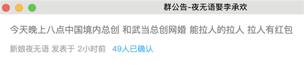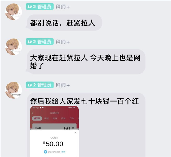 在网婚开始之前,管理员甚至会真金白银地发红包,来壮大群聊。