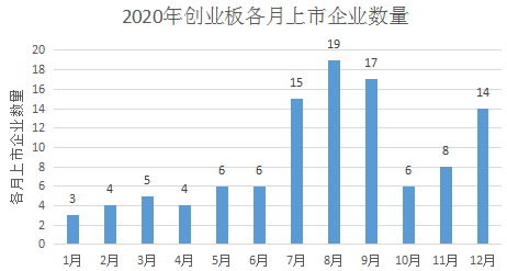 数据也能佐证,以创业板为例,Wind数据库显示,2020上半年创业板上市28家企业,下半年上市79家企业。其中,8月、9月和7月三个月份,上市企业数量在全年排名前三。显然,爆发式增长与注册制的实行有直接联系。