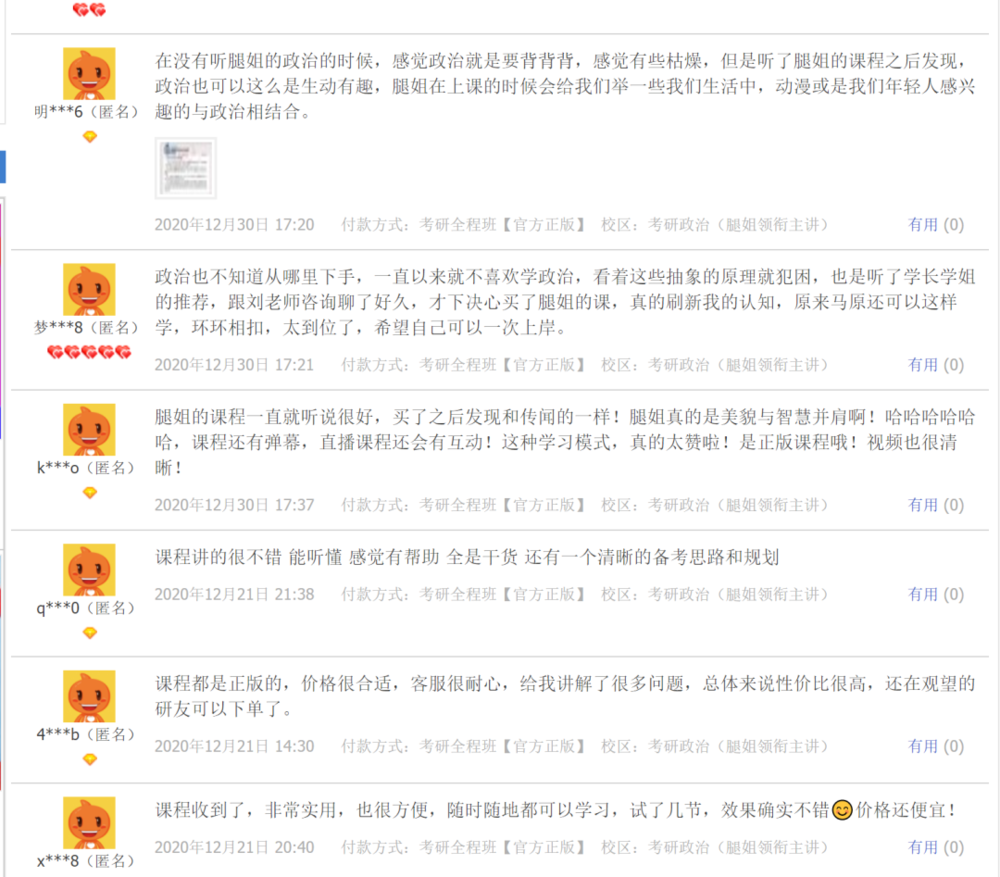 当然从评论区看,大多数消费者是认同“物有所值”的。在买家评价里“性价比”、“能听懂”、“清晰规划”被反复强调,也一一对应考研痛点。12月30日17点30分前后、12月21日等几个连续出现评论的时间点,似乎也说明以“买后返评”为代表的电商运营体系已经成熟运营,对应着市场需求及消费体验的的稳定。
