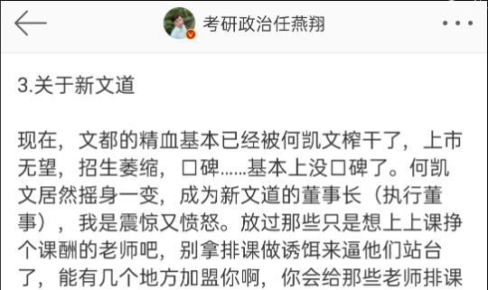 1月19日前后,一篇名为《何凯文不能引领考研教培行业·上》的文章在由考研培训名师任燕翔的微博发出。文章中,任燕翔细数另一位著名的网红考研名师何凯文私德败坏、学历造假;为虚假流量胁迫老师,绑架地方文都、欺骗学生;偷梁换柱,用压榨文都教育来建立自己的新文道等等罪状。