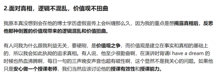 两天后的1月21日,任燕翔再次发出文章《何凯文不能引领考研教培行业(下)》。和上一次有许多实质性爆料不同,在这篇文章中,任燕翔对上一篇爆料的行为进行了更多的“原因解释”,将对“何凯文”的抨击定性为了“价值观之争”。