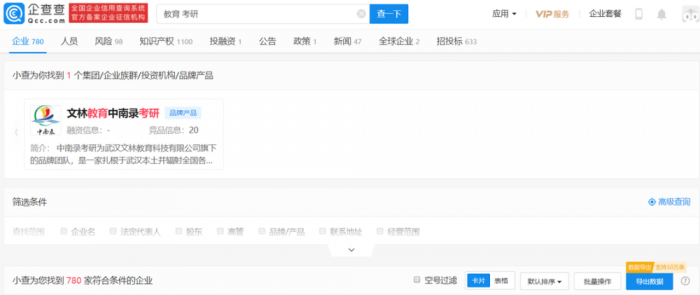 目前,考研教培行业主要的机构有新东方、文都教育、启航教育、海文教育等大大小小的企业。在“某企业信息查询平台”上搜索“考研”、“教育”两个关键字,就出来780家相关企业。这还不算每个学校内部还有学生自建的考研“小作坊”也在分食考研这块蛋糕。