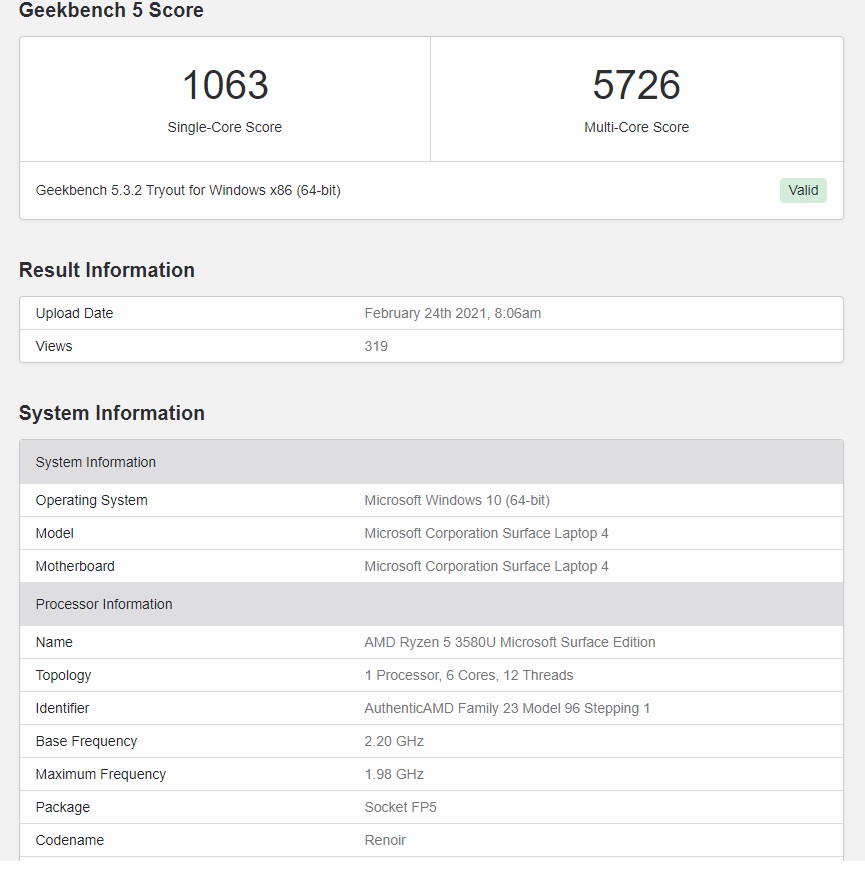 另一个基准显示,它内置一个定制的AMD处理器,但Ryzen 5 3580U被列在处理器名称旁边,但我们相信这只是一个占位符。这款未指明的处理器可能是AMD Renoir系列的一部分,但我们不知道微软是否打算使用Ryzen 5 4000或5000。