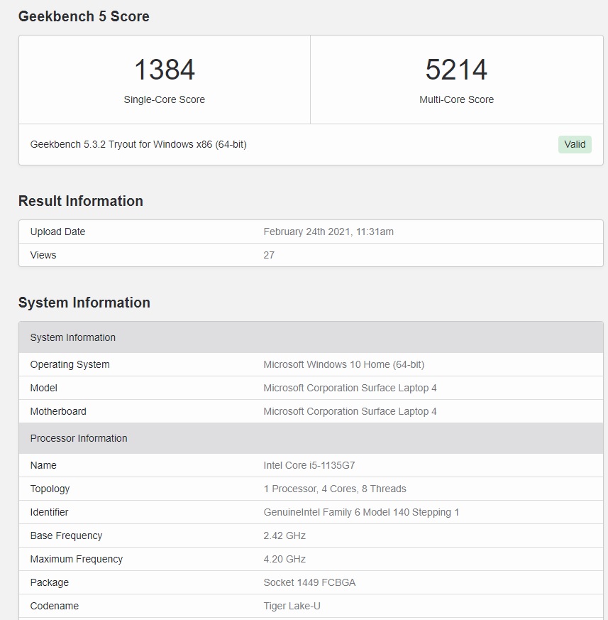 现在,新泄露的基准显示了Surface Laptop 4的多种配置。在一个基准中,这款笔记本使用的是英特尔酷睿i5-1135G7(Tiger Lake-U),最高时钟速度为4.40Ghz,内存为8GB。