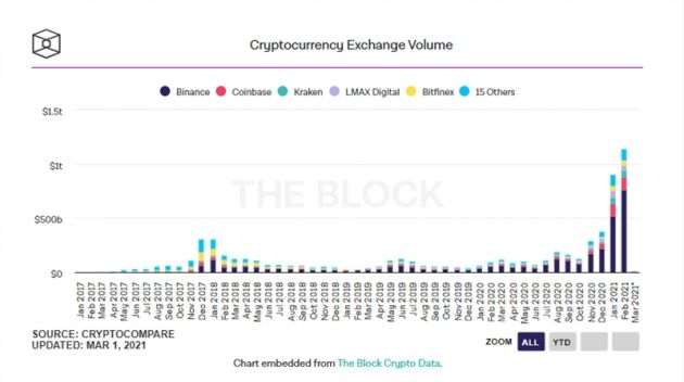 据The Block Research统计的加密货币交易数据显示,今年2月份,加密货币交易量超1万亿美元,创下新纪录。截至2月26日,加密货币月度交易量为1.05万亿美元,比一月份增加了1439亿美元,增幅为15.9%。