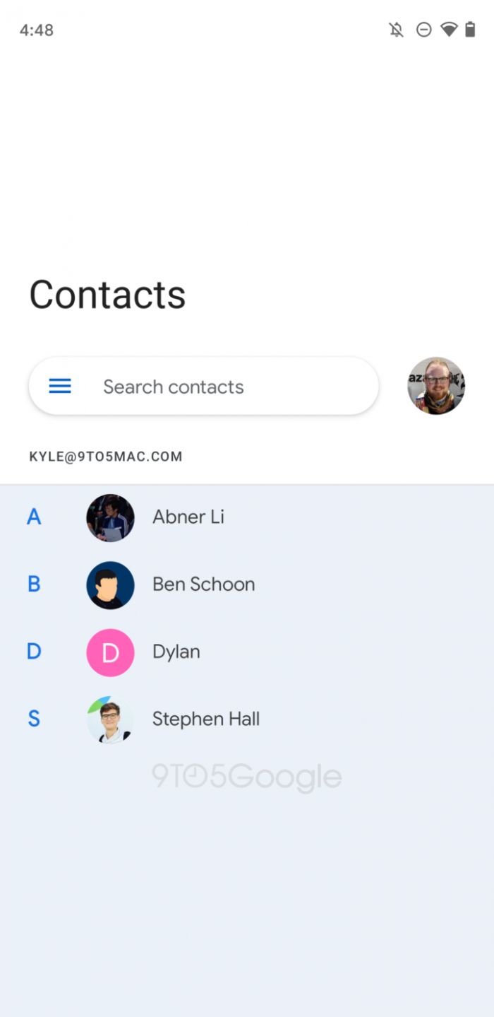 Play Store在设计上有了很好的变化,看起来和我们在三星的One UI中看到的很相似。当然,这仍然是一个模拟图,最终的设计很可能会改变,但现在看起来更干净,更容易使用。通讯录应用也进行了类似的重新设计,这将使人们更容易用单手使用手机。