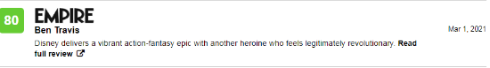 《帝国》杂志为本片给出80分好评:迪士尼与另一位女主角一起演绎了一部充满活力的动作幻想史诗,拉雅已经成为了迪士尼公主进化的下一步。