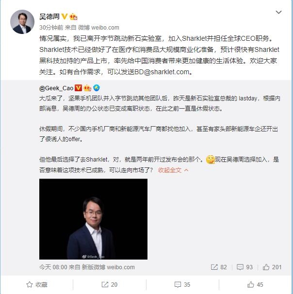 吴德周表示,我已离开字节跳动新石实验室,加入Sharklet(鲨纹科技)并担任全球CEO职务。