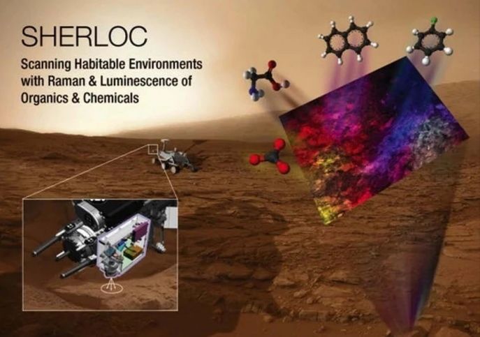 具体实现探测和检索功能的是以名侦探“夏洛克·福尔摩斯”命名的仪器 SHERLOC。SHERLOC 安装在毅力号机器臂前端,包括一个紫外激光拉曼光谱仪和一个昵称“华生”的相机,可以协同工作,精细探测火星表面的矿物成分、有机分子和可能的生命痕迹。