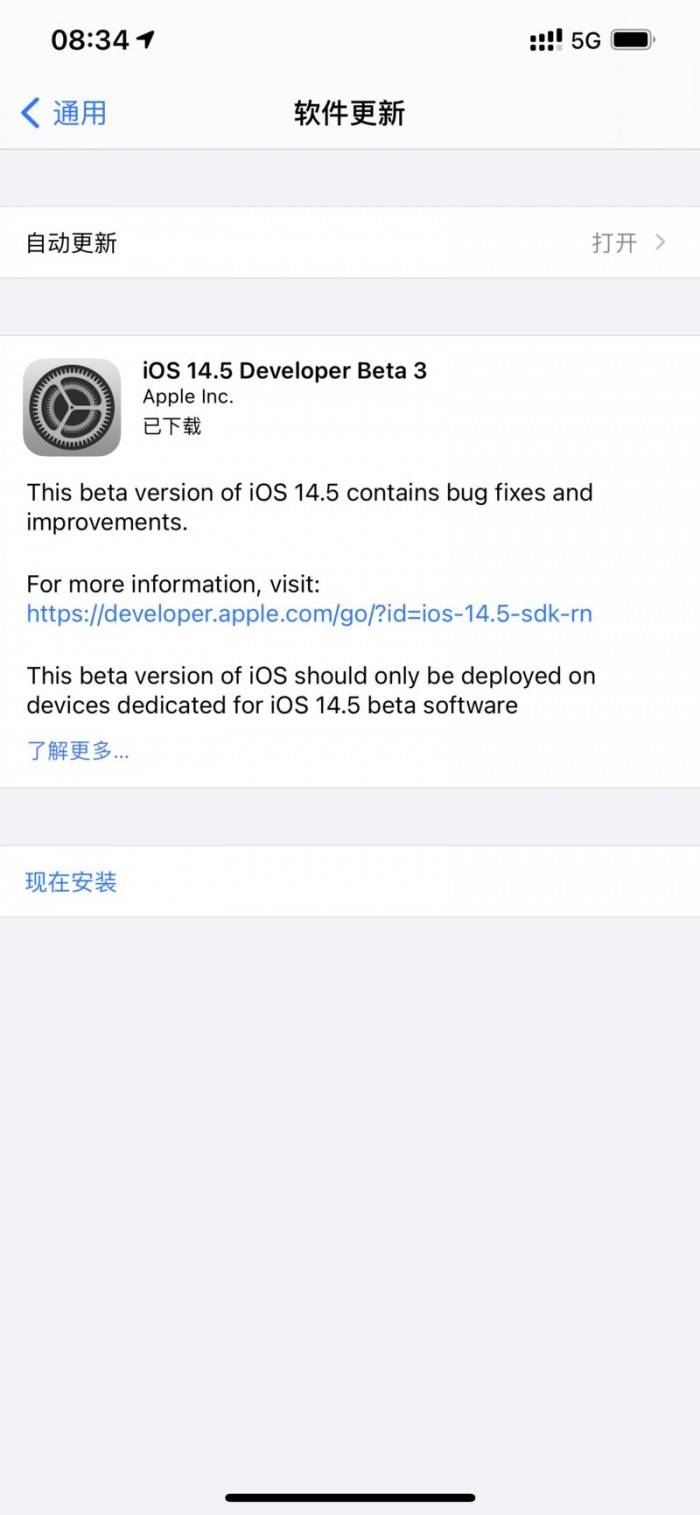 面向开发者,苹果今天发布了 iOS/iPadOS 14.5 的第 3 个测试版本,和上个测试版本相隔两周时间。开发者可以通过苹果开发者中心进行下载,也可以在 iPhone 或者 iPad 上安装适当的配置文件后进行 OTA 更新。