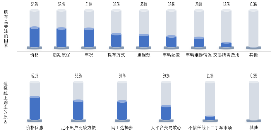 网络问卷调查主要了解消费者购车的影响因素、购买经历及遇到的问题等。本次调查共收集有效问卷4706份。七成受访者愿意通过网络平台购买二手车,二手车消费者最关注价格、质保、车况。