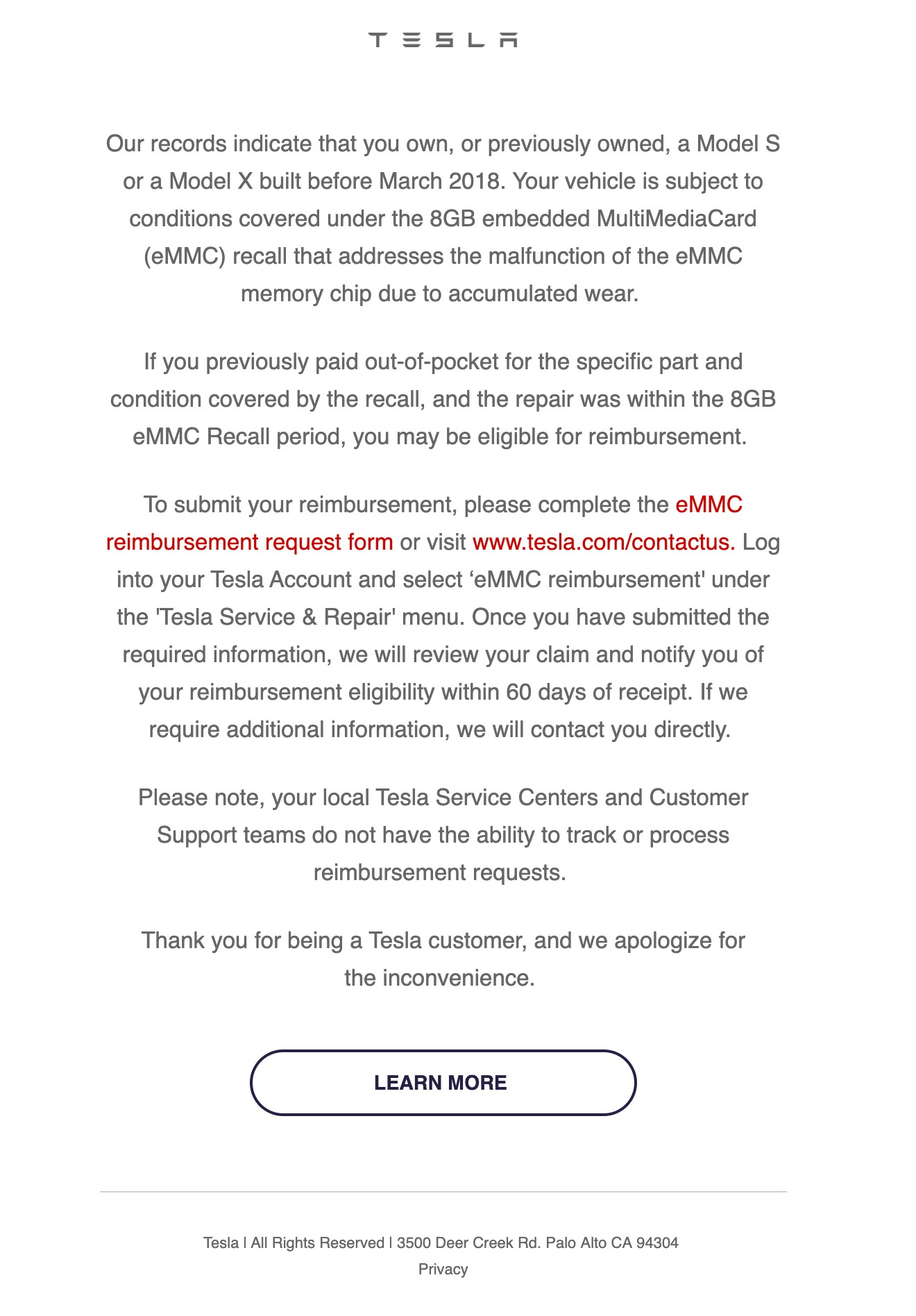 有些车主已经自行解决了这个问题,可能不得不自掏腰包更换eMMC。特斯拉表示:“如果您之前自费购买了召回范围内的特定部件,并且维修时间在8GB eMMC召回期限内,那么您可能有资格获得报销。”然后,特斯拉提供了一个链接,以完成要求获得报销的申请表,但车主也可以直接联系该公司。