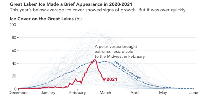 上面的图表显示了2020-2021年季节冰层覆盖面积的变化。Wang指出,气温是影响五大湖冰层覆盖的主要因素。这个季节开始时,气温异常温和,直到1月中旬,气温比正常水平高出8华氏度(4.5摄氏度)。伊利湖是五大湖中最浅的湖也是最先结冰的湖,是一年中有记录以来冰量最低的湖之一。