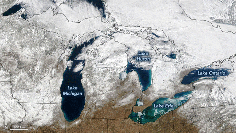 在这些由Suomi NPP卫星上的可见红外成像辐射计套件(VIIRS)获取的自然彩色图像中可以看到冰层覆盖的高位和地位。2月20日(上图),整个湖泊的总冰层覆盖达到了本季度最大的46.5%。到3月3日(下图),冰只覆盖了15%的湖面。