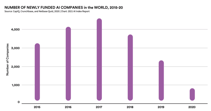 2020年,全球总投资,如私人投资和并购,增长了40%。但连续第三年,AI创业公司的资金流向的创业公司越来越少。