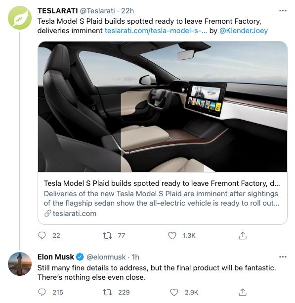 并且,外媒根据这些被运输车被批量拉走而推测,新款Model S Plaid可能即将交付。对此,马斯克表示是这并不是最终量产版,还有很多细节需要解决。