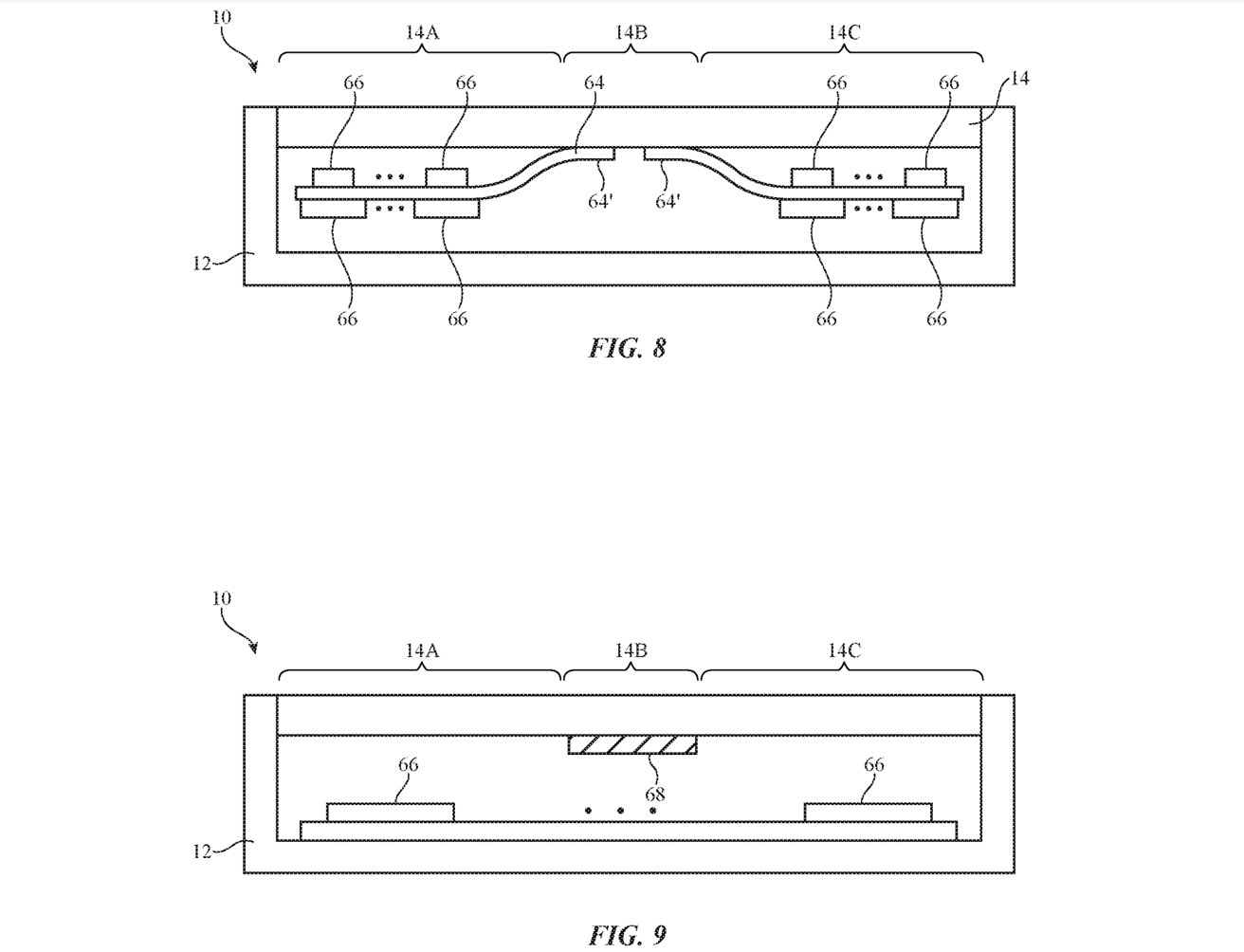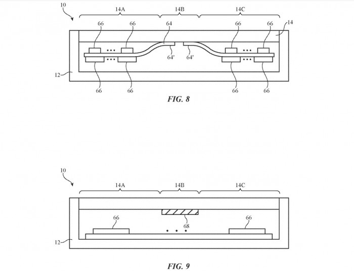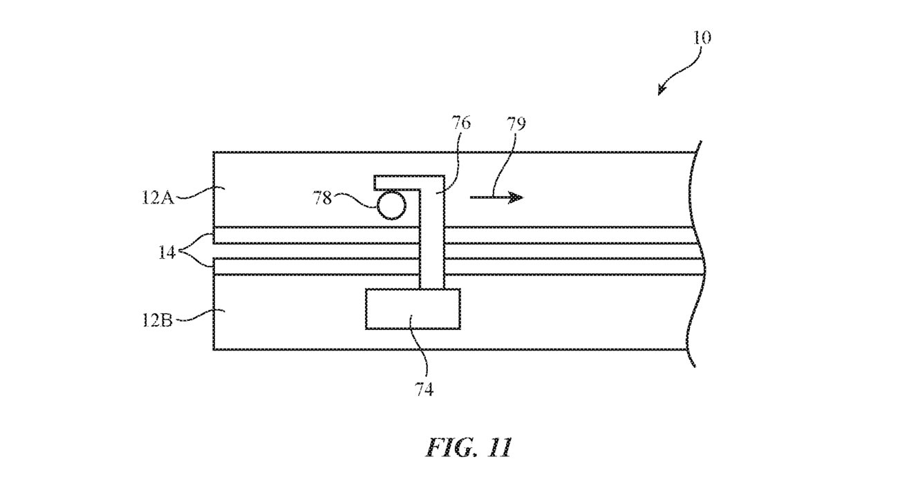 当屏幕遇冷时,一个锁扣可以防止可折叠iPhone被打开。机载传感器可以确定设备的温度是多少,以及显示屏在当前状态下弯曲是否安全。如果屏幕不能移动而不造成潜在的损坏,系统可以可行地警告用户危险,以及引入一个物理屏障。苹果在专利当中表示可以采用一个闩锁来保持智能手机的封闭性,直到屏幕温度高到足以安全弯曲。该系统可以使用一个致动器将锁扣固定在原地,并在不需要时将其脱离。