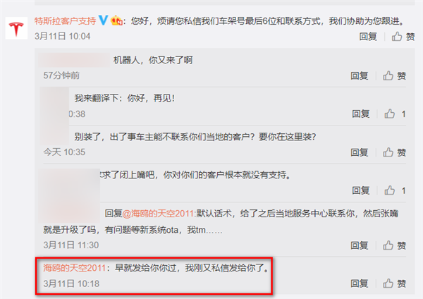 对此,特斯拉客户支持,也向车主进行了回应:“您好,烦请您私信我们车架号最后6位和联系方式,我们协助为您跟进。”车主对其表示,早就已经私发过了,刚又私发了一遍。