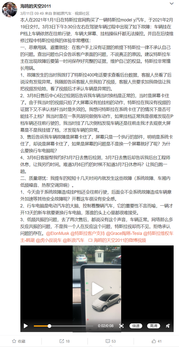 3月8日,售后检测后,告诉车辆当时换挡正常,但是屏幕卡住了。由于当时自己拍视频时,没有拍到挂挡的动作,特斯拉就不承认档杆当时是失效的。