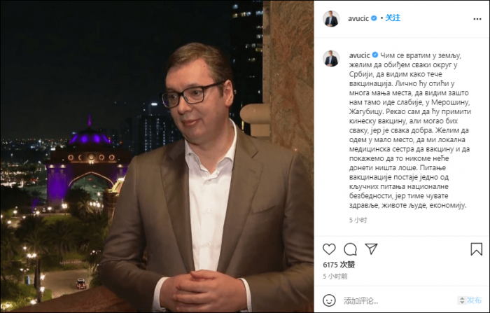 值得注意,武契奇可能很快将此前的承诺付诸行动。“等我一回到塞尔维亚,我会去各处检查为什么农村的疫苗接种率那么低。我将在美罗希纳或扎古比卡接种中国国药疫苗,虽然(中俄的)两种(疫苗)都很棒。我会去一个非常小的地方,找一个当地护士帮我接种。”