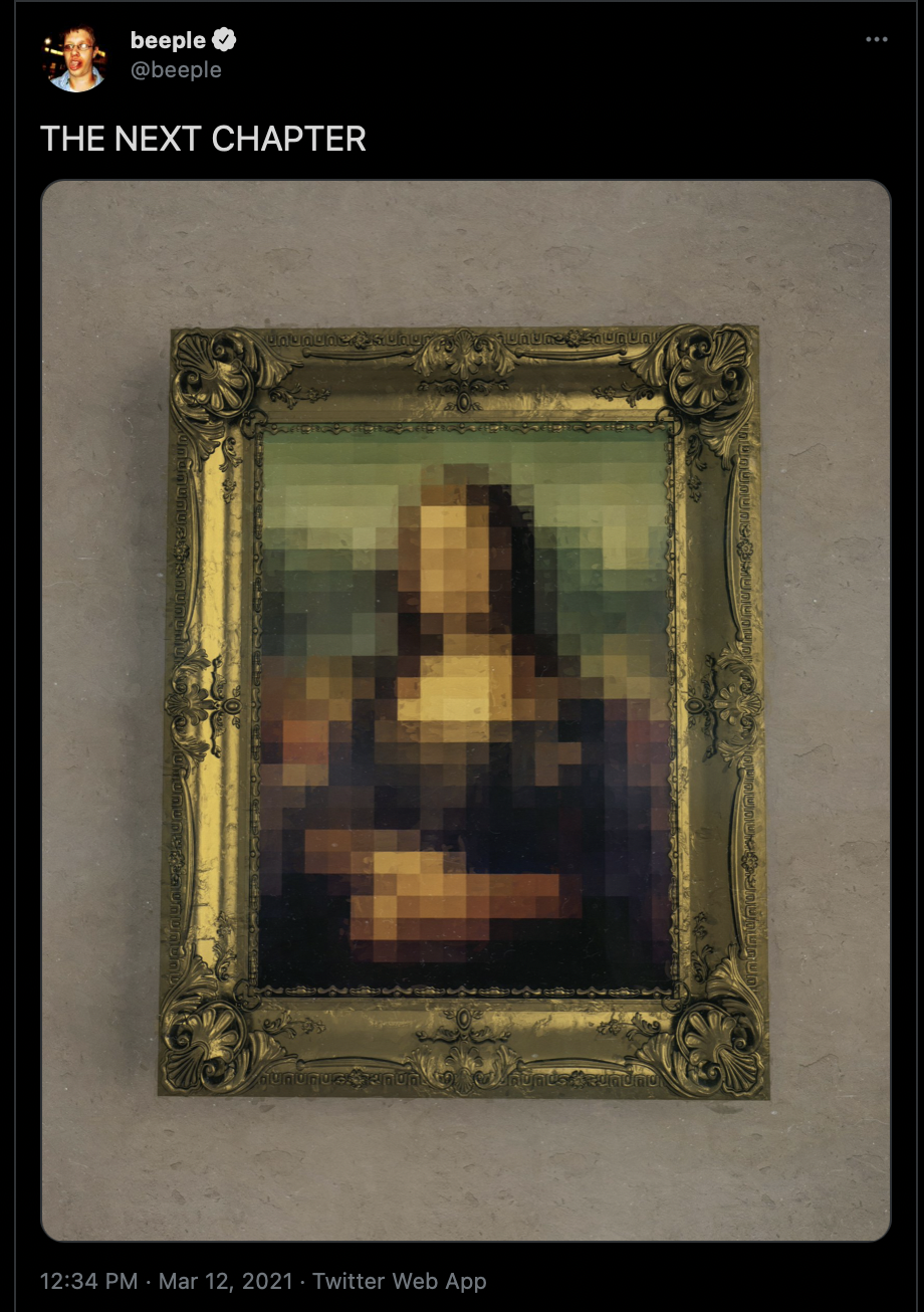 在《The First 5000 Days》拍卖落槌后,Beeple在社交媒体发出感叹,随后发布一副像素版的《蒙娜丽莎》,并配文称“下一个章节”。