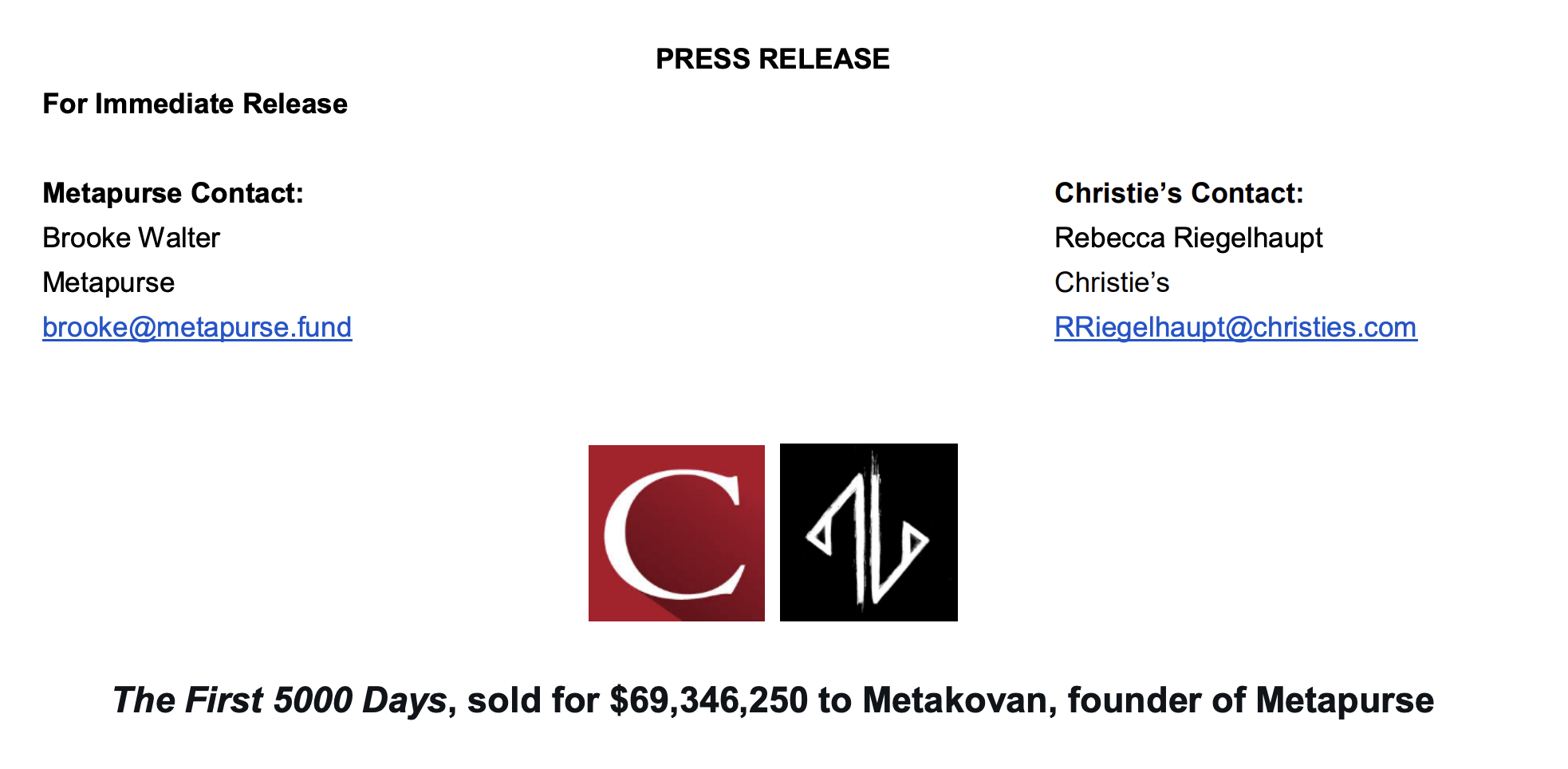 当地时间3月12日,佳士得拍卖行和Metapurse公司发布联合声明,以6934.625万美元成交的NFT作品《The First 5000 Days》的买家,是Metapurse的创始人MetaKovan。MetaKovan本就是知名的NFT收藏家,曾以220万美元在NFT交易平台Nifty Gateway购买Beeple的Everydays:2020系列。
